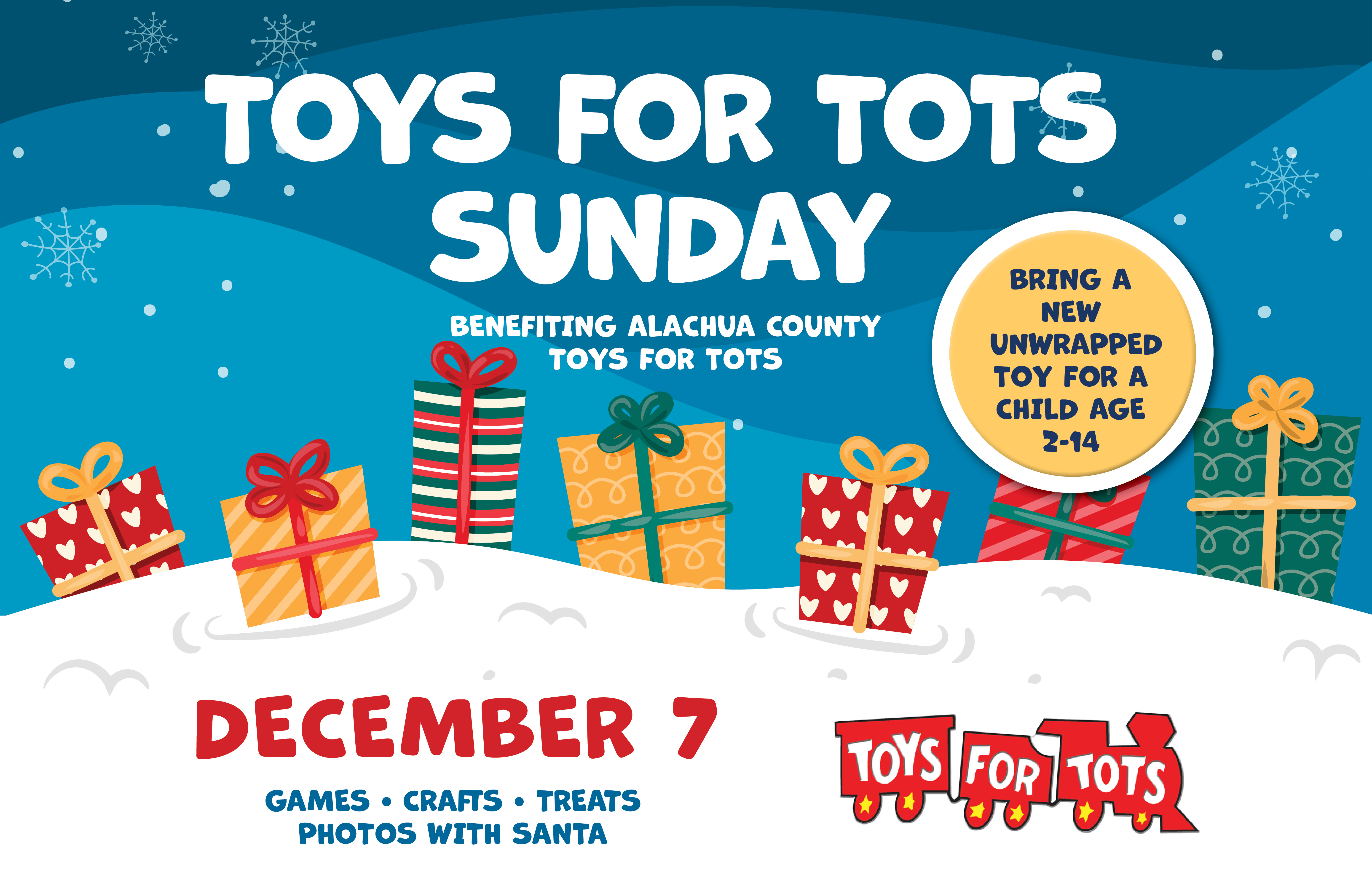 We love partnering with Alachua County USMCR Toys For Tots and their goal to bring hope to children every Christmas. Bring a new and unwrapped toy Sunday, December 7 to donate and after each service kids will enjoy games, treats and photos with Santa and Mrs. Claus! This is the perfect way to start your Christmas season!