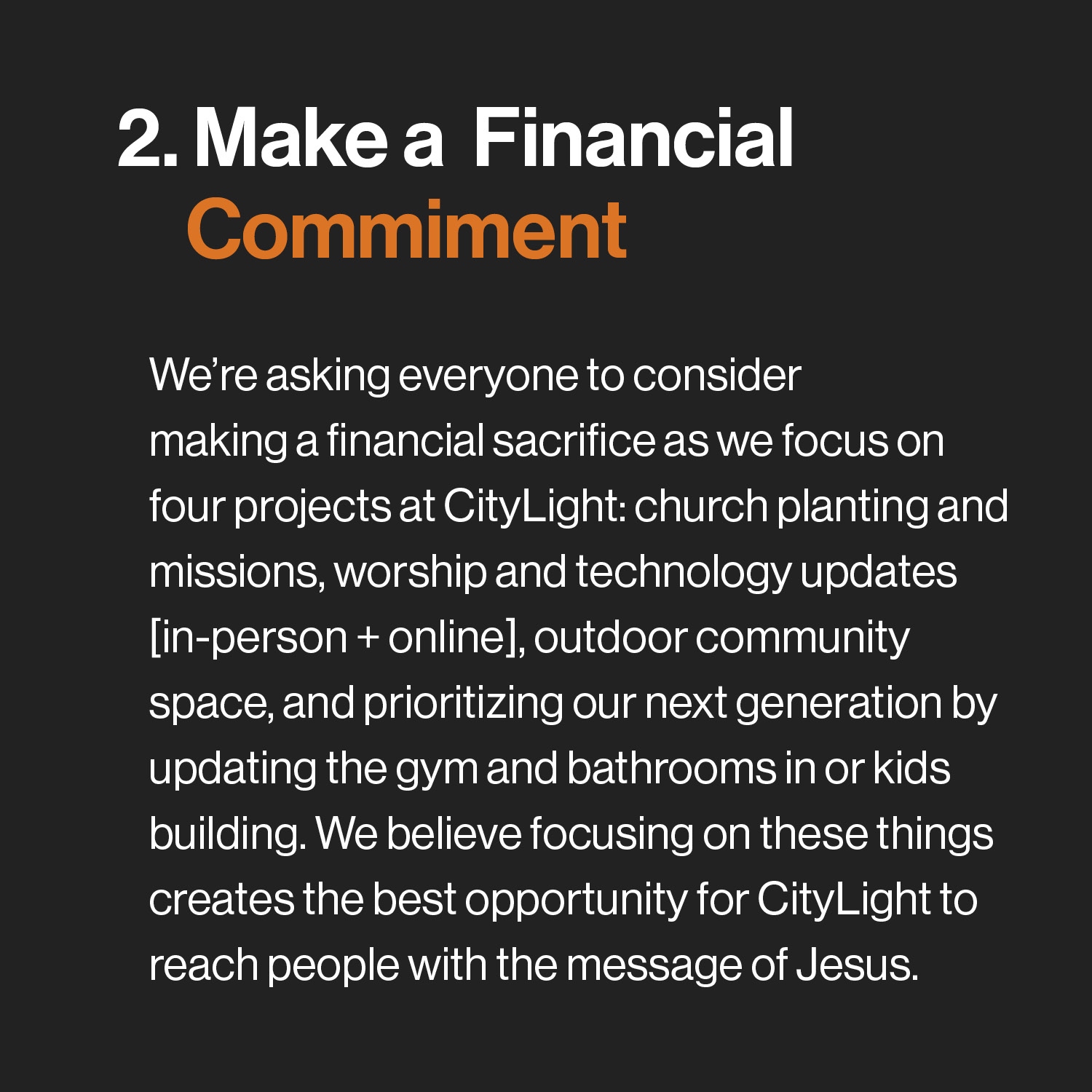 Over the past year, our leadership has been prayerfully seeking God’s direction for the next season of CityLight. We have committed to walk boldly into God’s plans for us, with the knowledge that obedience will require sacrifice and will come with triumph for the kingdom of heaven. As a result, we are inviting our church family to join us a we launch a vision campaign called The One Movement. This movement focuses on two priorities: investing personally in people who don’t yet know Jesus, and preparing our campus to serve the people God brings our way.